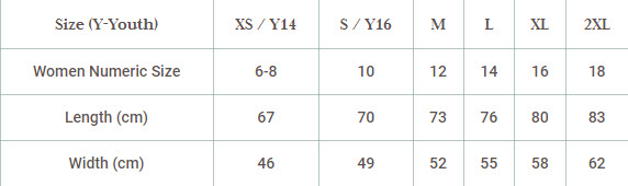| Width (cm) | 46 | 49 | 52 | 55 | 58 | 62 |